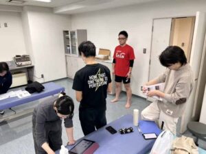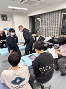 年末年始の休みに入る前、3年生の授業の一環として、模擬的な患者に対して身体の状況を把握する(評価する)授業を行いました!ちなみに、その模擬患者役をしたのは…4年制コース(夜間)の教員の精鋭たちです!!