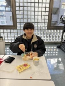 写真は、勉強の合間に昼食をとる学生の様子です。